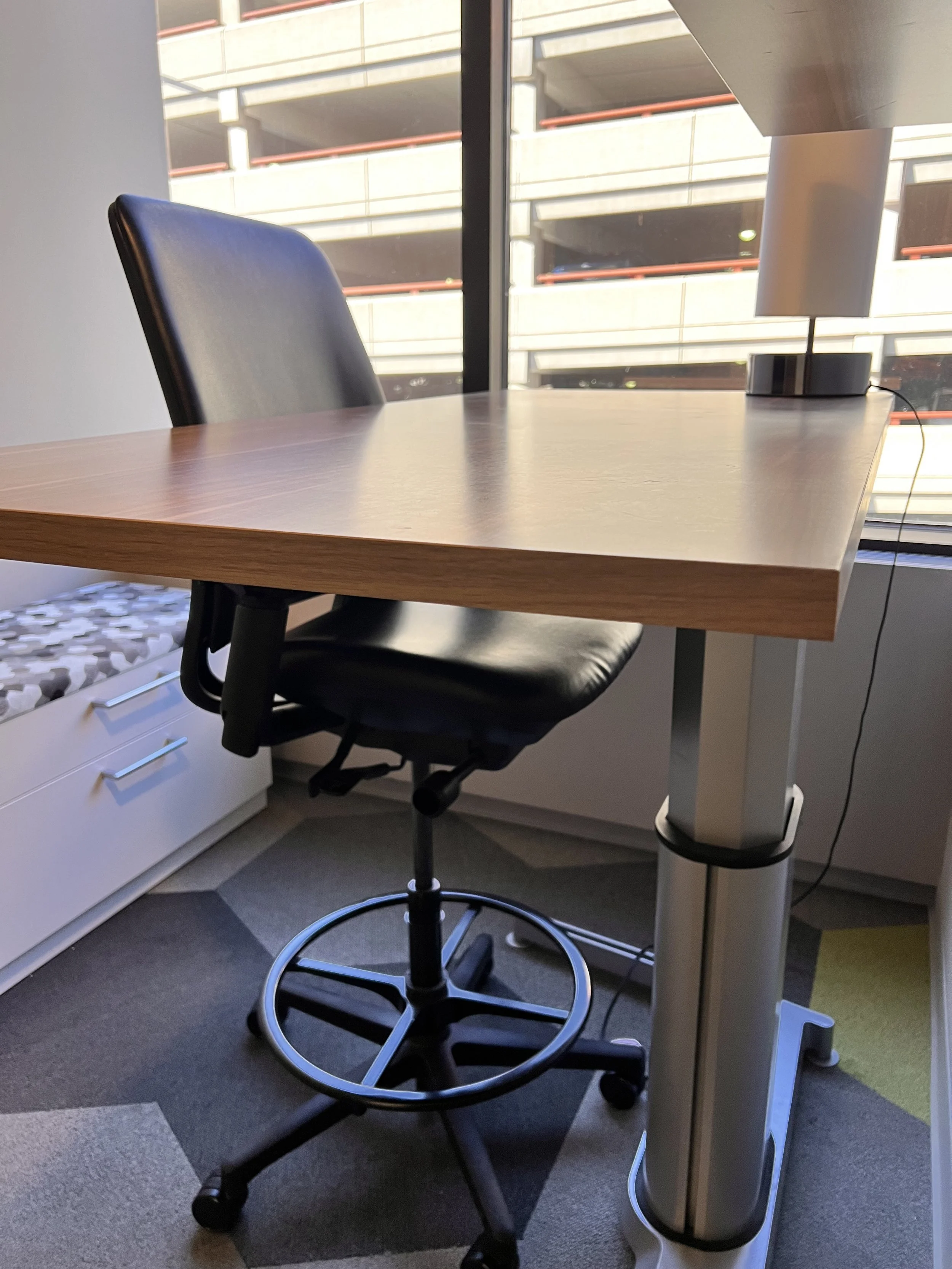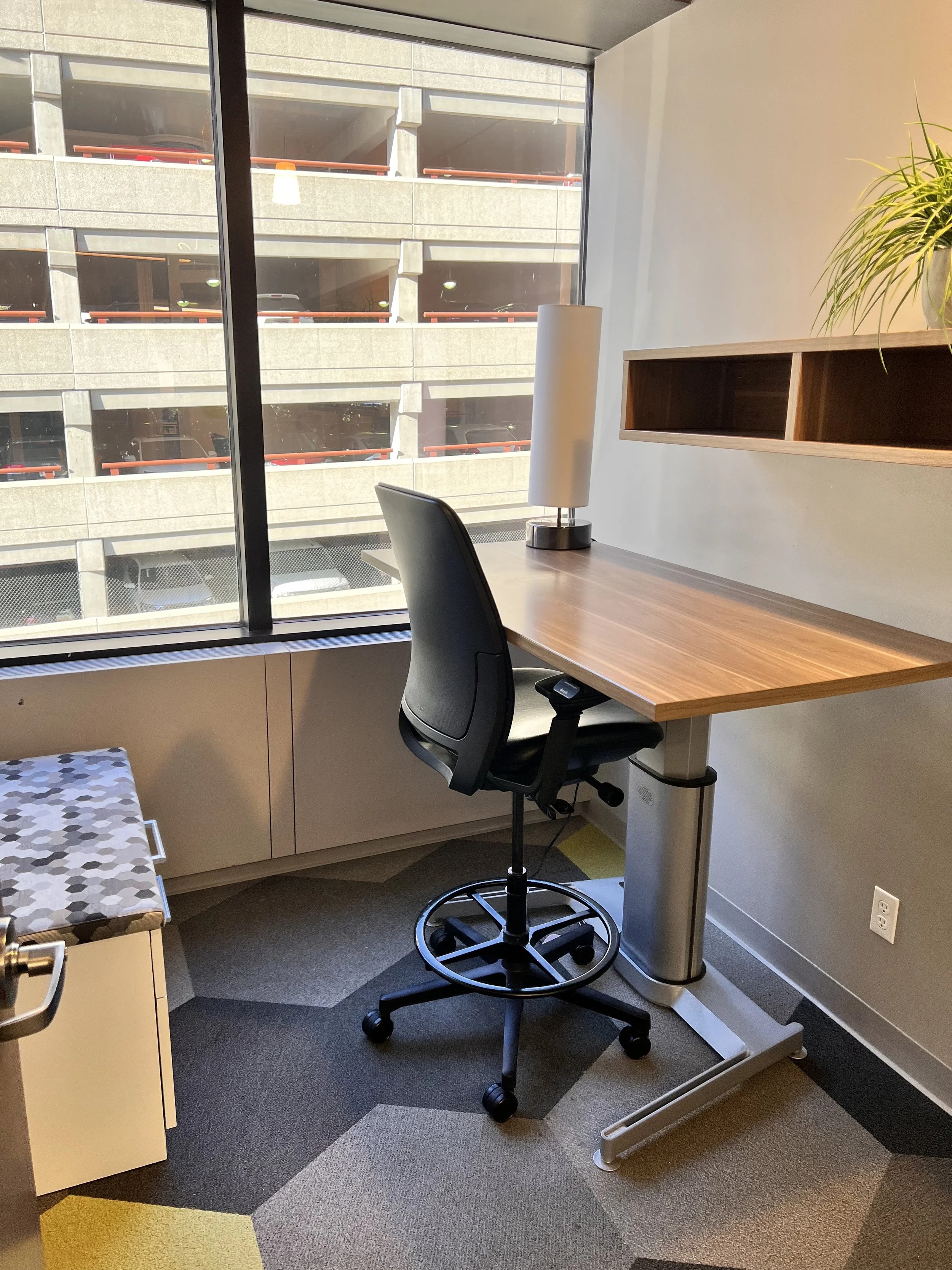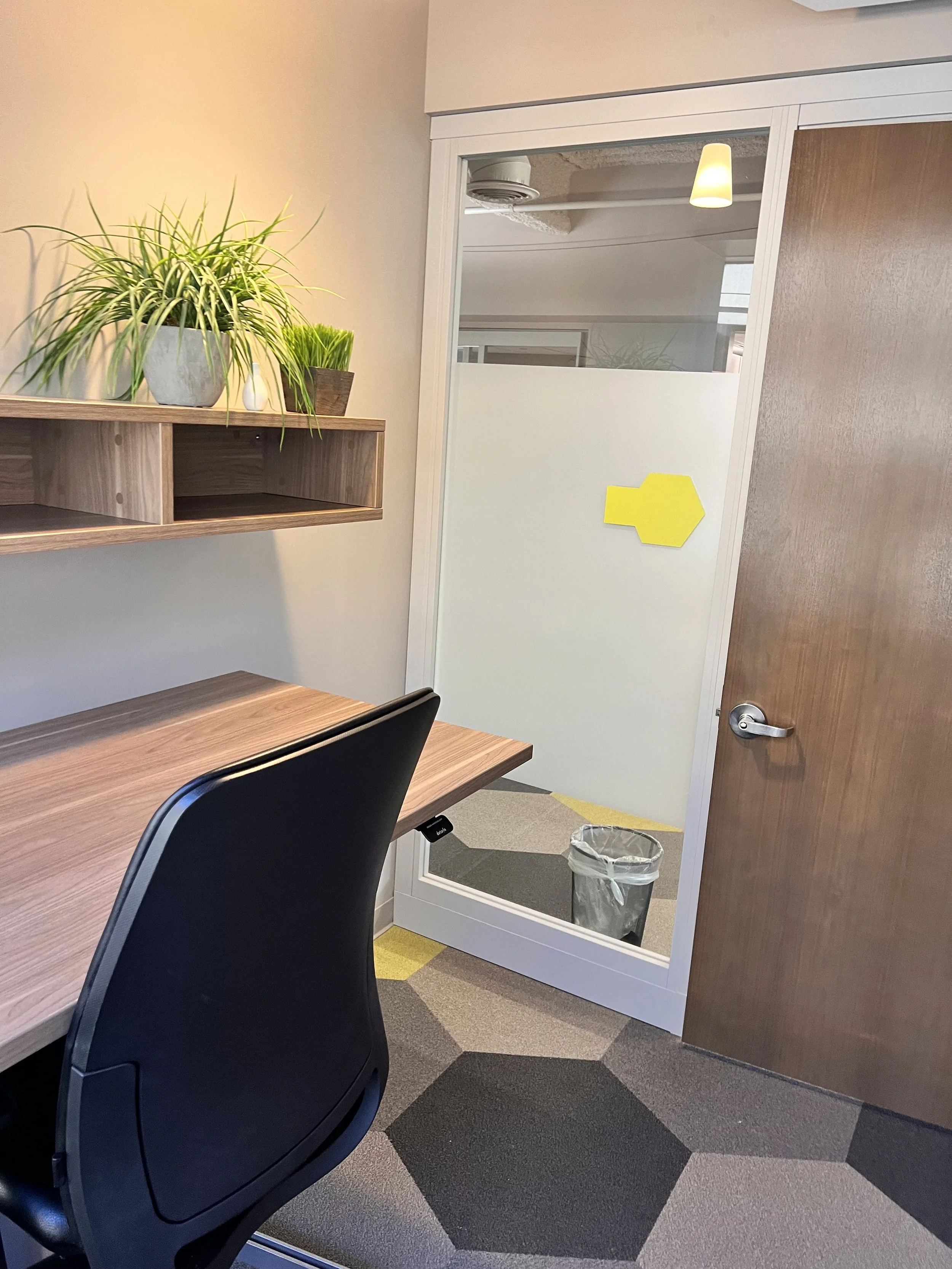Pod Desks are semi-private offices but allow you to get all the other amenities of a private office in downtown Grand Rapids. The sleek design of our Pod Desk, features frosted privacy panels for focus, an ergonomic chair for comfort, and an additional monitor for productivity. This setup blends modern aesthetics with functionality, making it ideal for professionals seeking a refined workspace.